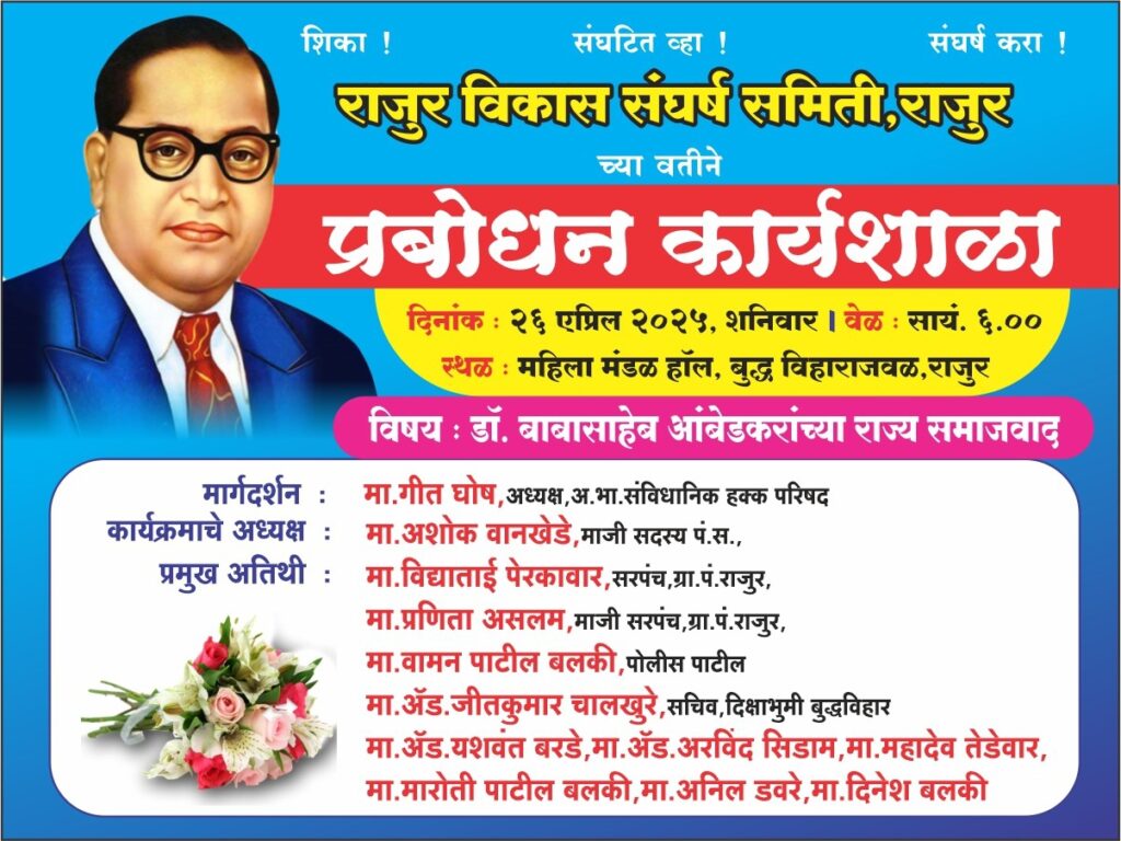 दिनांक २६ एप्रिल २०२५ रोज शनिवारला सायंकाळी ६ वाजता राजूर येथील महिला मंडळ हॉल येथे “डॉ. बाबासाहेबांचा राज्य समाजवाद” ह्या विषयावर अ. भा. संविधानिक हक्क परिषदेचे अध्यक्ष मा. गीत घोष यांचे मार्गदर्शन होणार आहे.