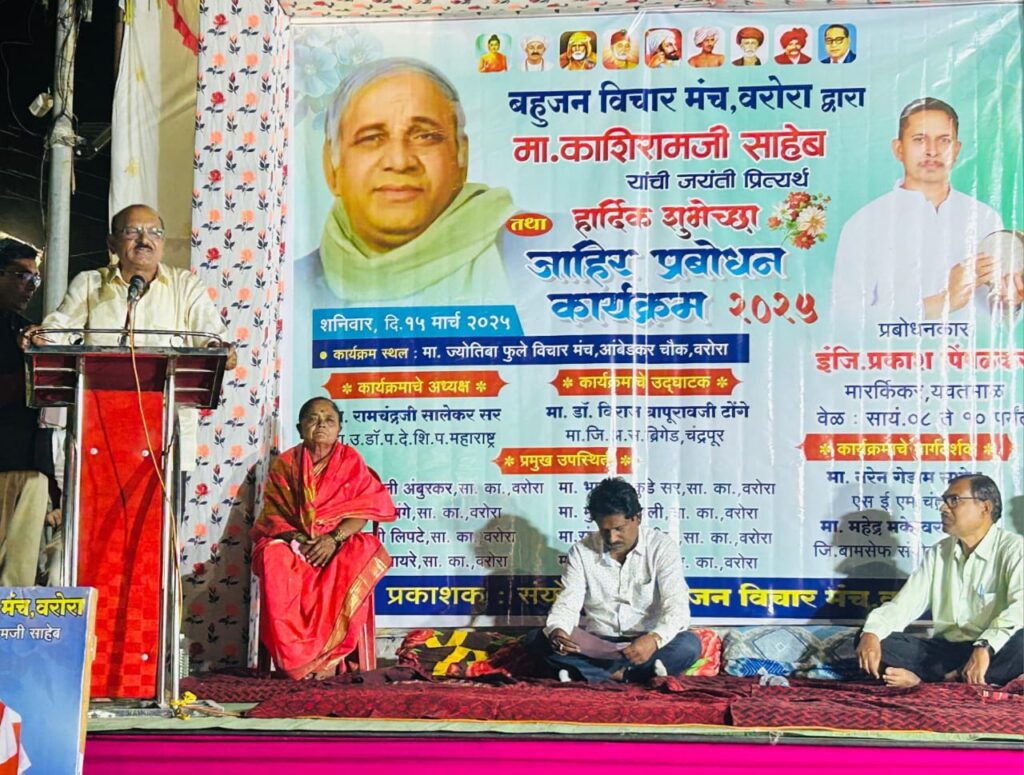 वरोरा येथे: दि. १५ मार्च २०२५ ला मान्यवर कांशीराम यांचा ९१ वा जयंती समारोह बहुजन विचार मंच वरोरा द्वारा महात्मा जोतिबा फुले विचारमंच आंबेडकर चौक वरोरा येथे रामचंद्र सालेकर, राज्य उपाध्यक्ष,शिक्षणमहर्षी डॉ.पंजाबराव देशमुख शिक्षक परिषद महाराष्ट्र यांचे अध्यक्षतेखाली संपन्न झाला. कार्यक्रमाचे उदघाटक डॉ. विराज टोंगे माजी जिल्हाध्यक्ष संभाजी ब्रिगेड चंद्रपूर तर प्रमुख मार्गदर्शक नरेंन गेडाम एस.ई.एम. चंद्रपूर, प्रबोधनकार इंजि. प्रकाश पिंपळकर मारकीकर यवतमाळ, बहुजन विचार मंचचे प्रमुख तथा कार्यक्रमाचे आयोजक ऍड. रोशन नकवे, सामाजिक कार्यकर्ते सुखदेव अंबुरकर,पी.एम.डांगे, वसंत लिपटे, यशवंत सायरे,भास्कर कुडे, मुस्ताक अली,संजय बिरिया,साबणभाई,छायाताई धोटे यांचे प्रमुख उपस्थितीत संपन्न झाला.