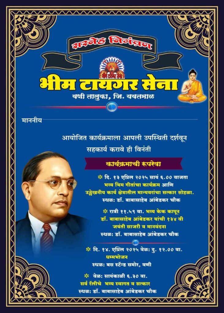 तसेच, १४ एप्रिल २०२५ रोजी दुपारी १२.०० वाजता धम्मभोजन वणी बस स्टॅन्ड समोर, आणि सायं. ६.३० वाजता डॉ. बाबासाहेब आंबेडकर चौका सर्व रॅलीचे स्वागत व सत्कार केला जाईल. कार्यक्रमासाठी भीम टायगर सेनेचे जिल्हाध्यक्ष योगेश भाऊ रायपुरे व अन्य पदाधिकारी यांनी समाजबांधवाना उपस्थित राहण्याचे आवाहन करण्यात आले आहे.