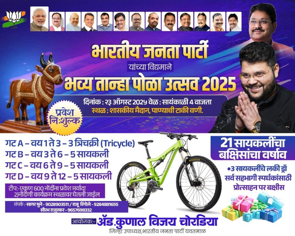 वणी (प्रतिनिधी) : वणी शहरात पारंपरिक उत्साहात मोठा पोळा उत्सव दिनांक 22 ऑगस्ट 2025 रोजी शासकीय मैदान, पाण्याची टाकी येथे साजरा करण्यात येणार आहे. या उत्सवाच्या निमित्ताने उत्कृष्ट बैल जोडी व सजावट स्पर्धा आयोजित करण्यात आली आहे.