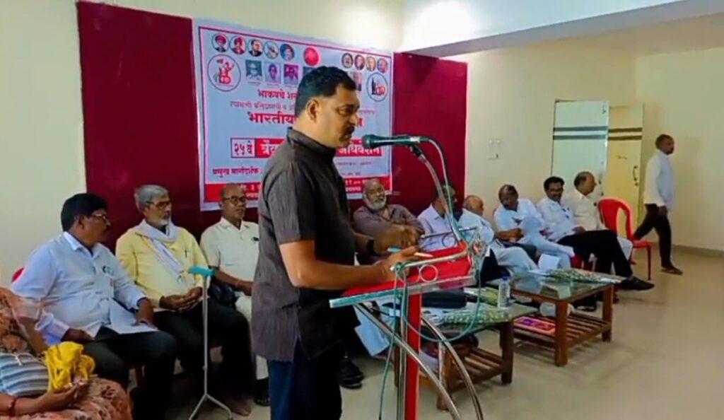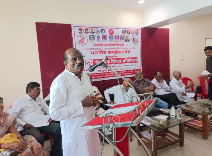 वणी(यवतमाळ) – भारतीय कम्युनिस्ट पक्षाचे त्रैवार्षिक जिल्हा अधिवेशन 3 जून रोजी वणी येथील वसंत जिनींगच्या सभागृहात उत्साहात संपन्न झाले.जिल्हयातील वणी,मारेगाव,झरी,राळेगाव,बाभुळगाव,नेर,यवतमाळ,दिग्रस,पुसद,आर्णी या दहा तालुक्यातुन आलेल्या 122 प्रतिनीधींच्या अधिवेशनाचे उद्घाटन राष्ट्रीय विद्यालय,राजुरचे सेवानिवृत मुख्याध्यापक काॅ.पांडुरंग किन्हेकार यांनी केले.अध्यक्षमंडळात बाभुळगावचे जेष्ट नेते काॅ.गुलाबराव उमरतकर व दिग्रसचे जेष्ट नेते प्रसिद्ध पत्रकार काॅ.पि.जी.गावंडे उपस्थित होते.