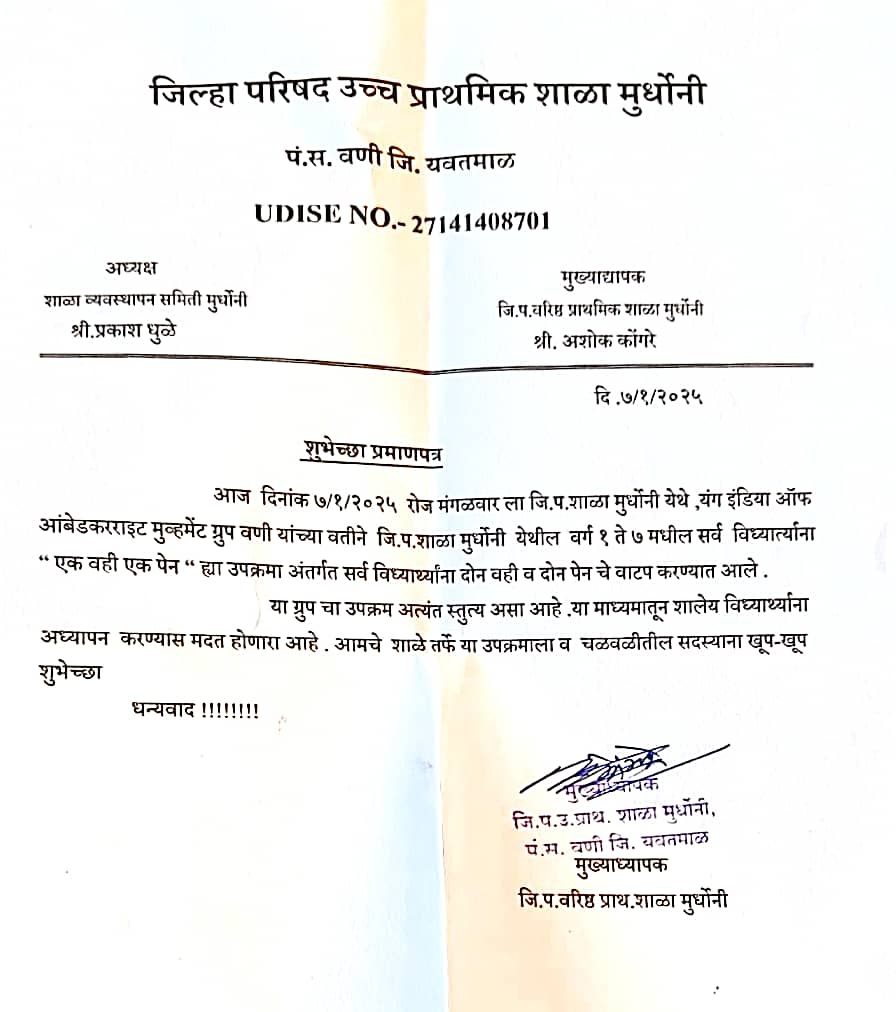 यानंतर विश्वरत्न डॉ बाबासाहेब आंबेडकर महापरिनिर्वाणदिनी आयोजित “एक पेन एक वही” या उपक्रमात आलेल्या शालेयउपयोगी साहित्याचे वाटप शाळेतील सर्व विद्यार्थ्यांना करण्यात आले. यावेळी हा कार्यक्रम यशस्वी करण्याकरिता ज्यांचा सिंहाचा वाटा आहे असे मार्गदर्शक हेमंत टिपले व शाळेतील सर्व शिक्षक वर्ग तसेच यंग इंडिया ऑफ आंबेडकराईट मूव्हमेंट चे सर्व सन्माननीय पदाधिकारी रज्जत सातपुते प्रेम अडकीने, आकाश बोरकर, सुरज खैरे ,काजल वाळके,श्वेता माहुरे, ऋचा दारुंडे,राहुल घोस्की, इस्माईल खान उपस्थित होते.