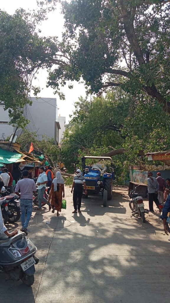 वणी : शहरातील नगर परिषद जवळील भाजी मंडीसमोर आज दुपारी ३ वाजताच्या दरम्यान एक मोठा वृक्ष पडल्याने एक व्यक्ती जखमी झाले. या परिसरात अनेकांचे मोठे नुकसान झाले असे सांगण्यात येत आहे. घटनेमुळे परिसरातील वीज तार तुटून लाईन बंद झाली असून, पालिका कर्मचारी आणि लाईनमन घटनास्थळी पोहोचले असून रस्ता मोकळा करण्याचे काम सुरू आहे.