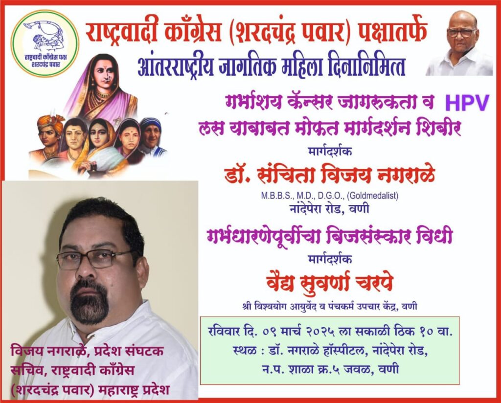 वणी – शहरात ९ मार्च २०२५ रोजी आंतरराष्ट्रीय महिला दिनानिमित्त गर्भाशय कॅन्सर जागरूकता व HPV लस याबाबत मोफत मार्गदर्शन शिबिराचे आयोजन करण्यात आले आहे. हे शिबिर राष्ट्रवादी काँग्रेस (शरदचंद्र पवार) पक्षाच्या वतीने आयोजित केले आहे.