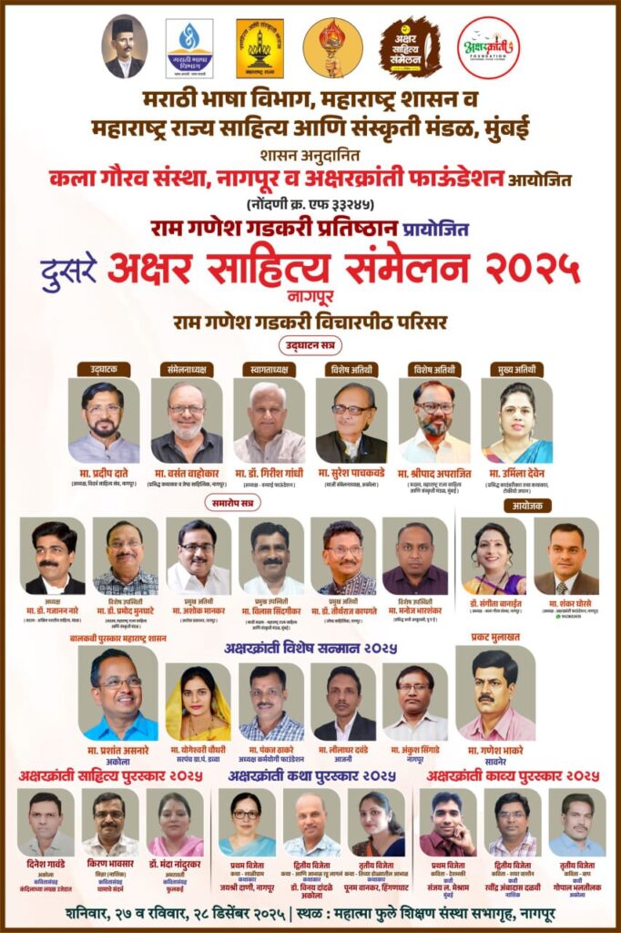 वणी (प्रतिनिधी): मराठी भाषा विभाग, महाराष्ट्र शासन व महाराष्ट्र राज्य साहित्य आणि संस्कृती मंडळ, मुंबई यांच्या सहकार्याने शासन अनुदानित कला गौरव संस्था, नागपूर व अक्षरक्रांती फाऊंडेशन यांच्या संयुक्त विद्यमाने, तसेच राम गणेश गडकरी प्रतिष्ठानच्या प्रायोजकत्वाखाली दुसरे अक्षर साहित्य संमेलन २०२५ चे आयोजन करण्यात आले आहे. हे दोन दिवसीय साहित्य संमेलन शनिवार, २७ व रविवार, २८ डिसेंबर २०२५ रोजी राम गणेश गडकरी विचारपीठ परिसरातील महात्मा फुले शिक्षण संस्था सभागृह, नागपूर येथे होणार आहे. संमेलनात नामवंत साहित्यिक, कवी व विचारवंत विविध साहित्यिक विषयांवर आपले विचार मांडणार असून परिसंवाद, कविता संमेलने व सन्मान समारंभांचे आयोजन करण्यात आले आहे. साहित्यप्रेमी नागरिकांनी मोठ्या संख्येने उपस्थित राहावे, असे आवाहन आयोजकांच्या वतीने करण्यात आले आहे.