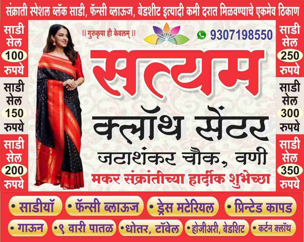 वणी डिजिटल जाहिरात सत्यम क्लॉथ सेंटर येथे: साड्यांची स्पेशल ऑफर सुरु.. NewWaniDiary 25/01/2025 नवीन साड्यांवर खास सवलती..स्वस्त दरात फॅन्सी साड्या, ड्रेस मटेरियल, आणि नवीन डिझाइन्स उपलब्ध.. पत्ता: जटाशंकर चौक, वणी संपर्क: मो. 9307198550, 8855816991 Continue Reading Previous: स्वातंत्र्य अबाधित ठेवण्यासाठीच प्रजासत्ताक?Next: वणी वकील संघाचा निवडणुकीत चुरशीचा लढाईत एकता पॅनल ला ७ तर विकास पॅनल ला ४ पदे Related Stories वणी घोन्सा आदर्श हायस्कूल व कनिष्ठ महाविद्यालय, घोन्सा येथे माजी विद्यार्थी स्नेहमिलन उत्साहात NewWaniDiary 26/02/2026 वणी वनाधिकार कायद्याच्या प्रभावी अंमलबजावणी साठी मार्क्सवादी कम्युनिस्ट पक्ष व किसान सभेने केले आंदोलन NewWaniDiary 25/02/2026 महाराष्ट्र वणी रायगड किल्ला येथे स्वच्छता अभियान; शिवसैनिकांकडून दोन महापुरुषांना मानवंदना NewWaniDiary 23/02/2026