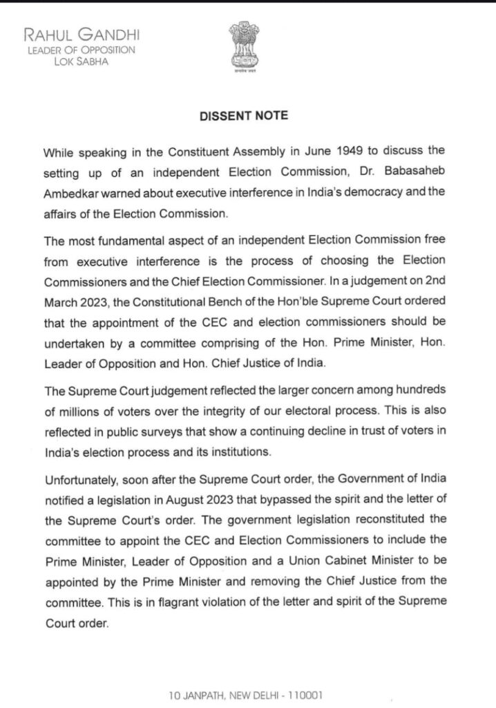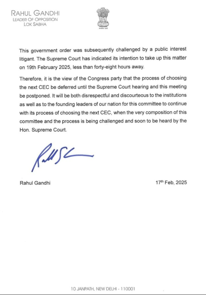 डॉ. बाबासाहेब आंबेडकर यांनी 1949 मध्ये संविधान सभेत स्वतंत्र निवडणूक आयोगाच्या महत्त्वावर भर दिला आणि कार्यकारी हस्तक्षेपाचा इशारा दिला होता. 2 मार्च 2023 रोजी, सर्वोच्च न्यायालयाने आदेश दिला की मुख्य निवडणूक आयुक्त (CEC) आणि निवडणूक आयुक्तांची निवड पंतप्रधान, विरोधी पक्षनेते आणि सरन्यायाधीशांच्या समितीने करावी. मात्र, ऑगस्ट 2023 मध्ये भारत सरकारने कायदा संमत करून या समितीतील सरन्यायाधीशांची जागा एका केंद्रीय कॅबिनेट मंत्र्याने घेतली, ज्यामुळे सर्वोच्च न्यायालयाच्या आदेशाचे उल्लंघन झाले. या निर्णयाला जनहित याचिकेद्वारे आव्हान देण्यात आले असून, सर्वोच्च न्यायालयाने 19 फेब्रुवारी 2025 रोजी प्रकरण ऐकण्याचा निर्णय घेतला आहे. काँग्रेसने सीईसीच्या निवडीची प्रक्रिया या सुनावणीपर्यंत थांबवण्याची मागणी केली आहे. ही माहिती 17 फेब्रुवारी रोजी लोकसभेतील विरोधी पक्षनेते राहुल गांधी यांच्या अधिकृत WhatsApp चॅनेलवरून मिळाली आहे.