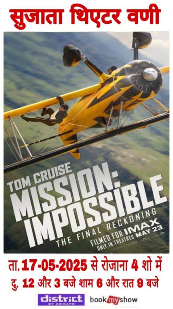 वणी Entertainment सुजाता थिएटर मे ता.17 मे से! टॉम क्रूज़ मिशन: इम्पॉसिबल रोजाना 4 शो मे! NewWaniDiary 17/05/2025 🎬 टॉम क्रूज़ मिशन: इम्पॉसिबल ता.17 से! रोजाना 4 शो मे! ✅ सुजाता थिएटर वणी मो. 9022027550 Continue Reading Previous: पुनवटजवळ मालवाहू वाहनाला आग, लाखोंचे नुकसान..Next: कुणी सांगितले म्हणून नाही तर स्वतः प्रेरित व्हा – प्रा. वैभव ठाकरे Related Stories वणी घोन्सा आदर्श हायस्कूल व कनिष्ठ महाविद्यालय, घोन्सा येथे माजी विद्यार्थी स्नेहमिलन उत्साहात NewWaniDiary 26/02/2026 वणी वनाधिकार कायद्याच्या प्रभावी अंमलबजावणी साठी मार्क्सवादी कम्युनिस्ट पक्ष व किसान सभेने केले आंदोलन NewWaniDiary 25/02/2026 महाराष्ट्र वणी रायगड किल्ला येथे स्वच्छता अभियान; शिवसैनिकांकडून दोन महापुरुषांना मानवंदना NewWaniDiary 23/02/2026