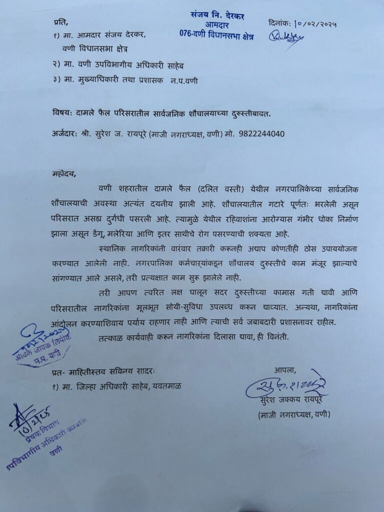 वणी – शहरातील दामले फैल (दलित वस्ती) येथील सार्वजनिक शौचालयाची अत्यंत दयनीय अवस्था झाली असून, तुंबलेल्या गटाऱ्यांमुळे परिसरात दुर्गंधी आणि आरोग्यविषयक धोके वाढले आहेत. सदर शौचालयाच्या नवीन बांधकाम मंजूर झाल्याचे नगरपालिका कर्मचाऱ्यांकडून (माजी नगराध्यक्ष) रायपुरे यांना सांगण्यात आले होते, परंतु अद्याप कोणतीही ठोस कार्यवाही झालेली नाही.